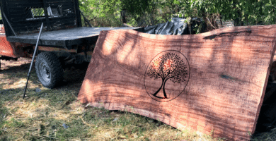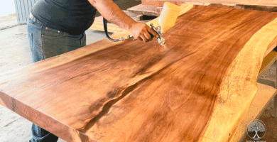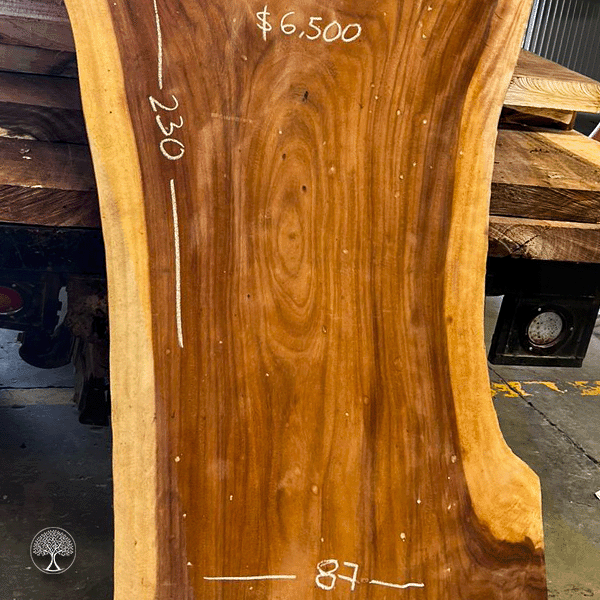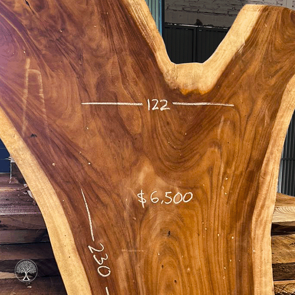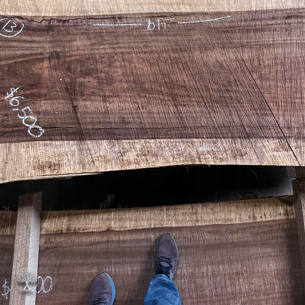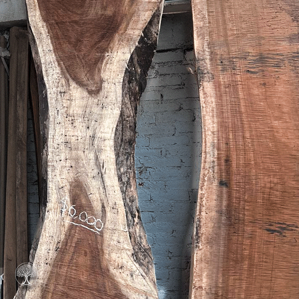 Aquí está la joya: el planchón recibe ese nombre porque es una sola pieza, cortada del árbol y conservando su forma. No hay uniones, no hay empalmes: cada pieza es distinta, por veta, tono y contorno natural.